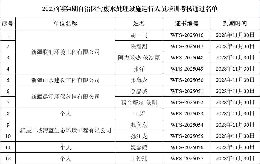 名單公布 | ?2025年第4期自治區(qū)污廢水處理工培訓(xùn)班考核通過名單公布